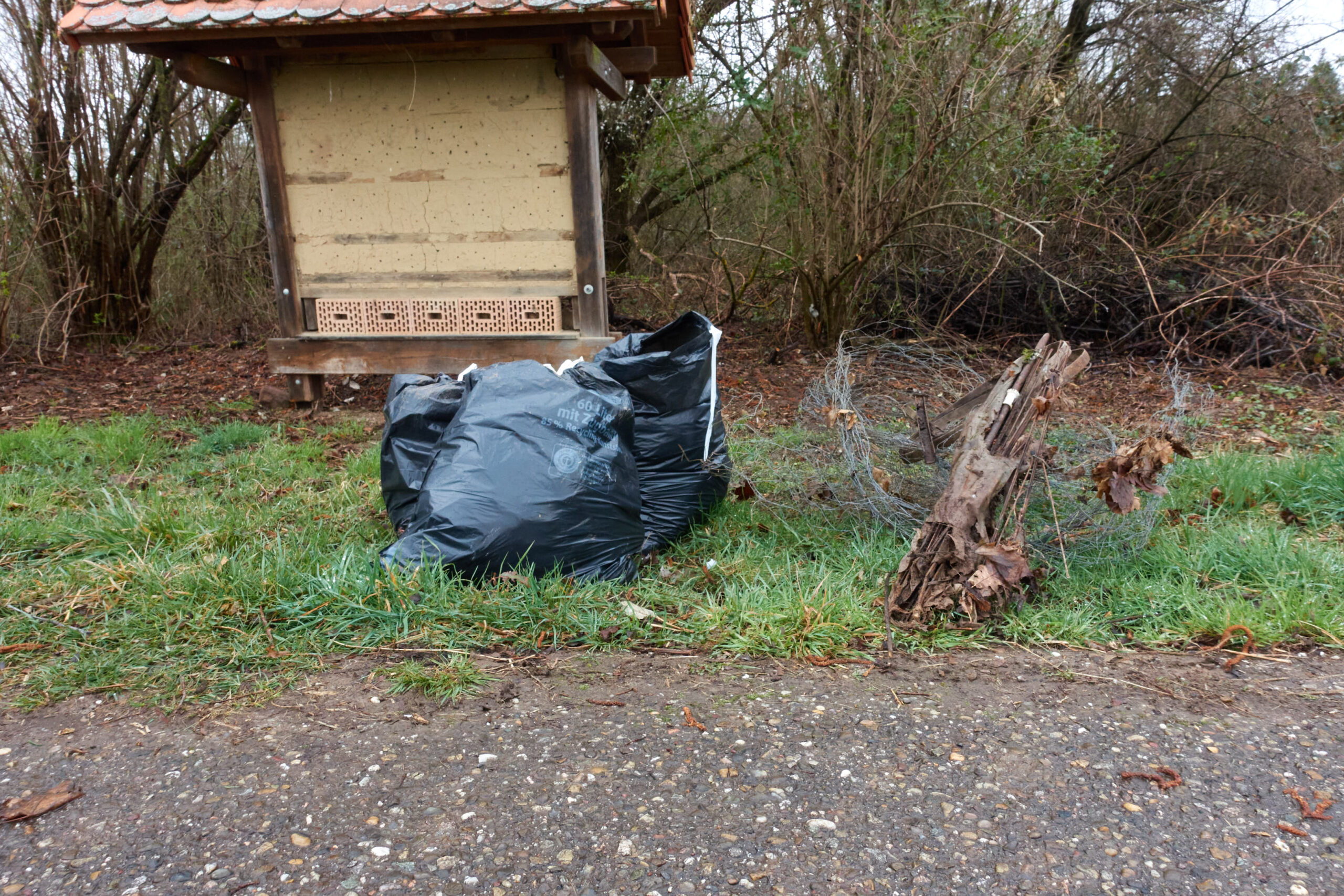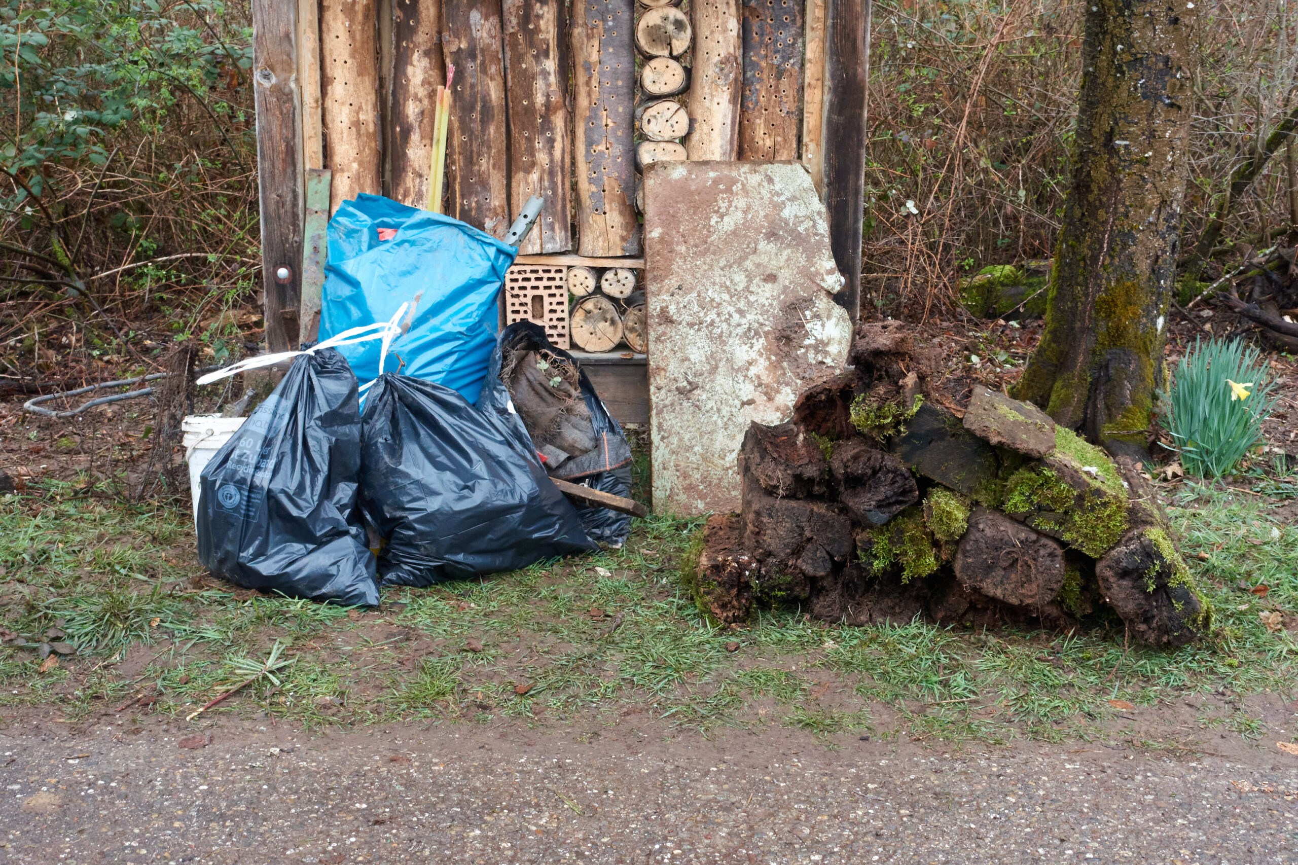Hier half nur noch grobes Werkzeug und ordentlich Muskelkraft! Nach zwei Stunden intensiver Arbeit war die Bilanz beachtlich: Sieben prall gefüllte Müllsäcke sowie ein beachtlicher Haufen Sperrmüll.