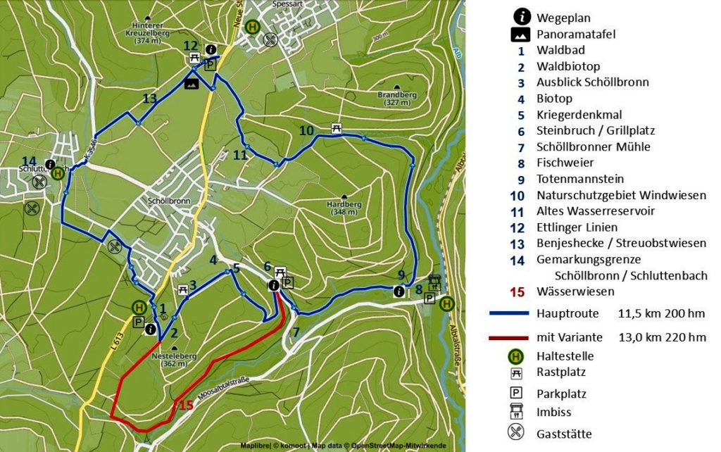 Er verbindet moderne Freizeitmöglichkeiten mit der historischen und kulturellen Identität der Gemeinde Schöllbronn. Sehenswürdigkeiten wie das Waldbad, die Schöllbronner Mühle und der Steinbruch bieten nicht nur Erholung, sondern auch historische Einblicke.